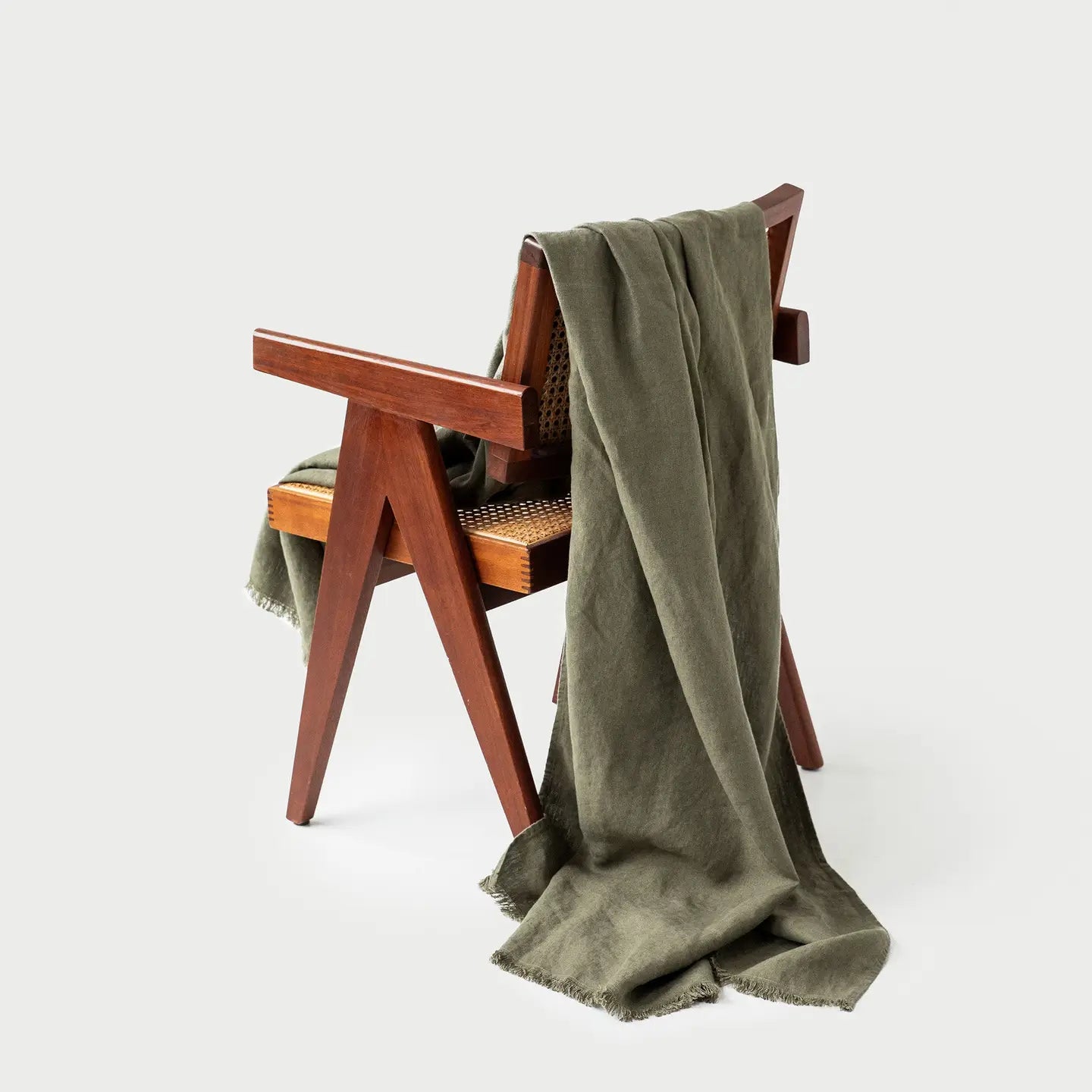 Rooted in quiet luxury and effortless layering, this linen fringe throw is the kind of staple that transforms a space. Woven from softened European flax and finished with hand-frayed edging, its earthy olive tone grounds the room while offering a lived-in, breathable feel. Lightweight yet substantial, it's perfect draped across a chair, sofa, or foot of the bed — inviting touch and warmth without weight.