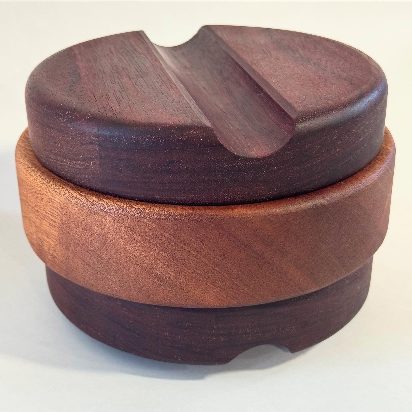 Crafted from Purpleheart and Sapele, this stacked vessel is composed of three interlocking layers. At its center lie two Rhodonite disks—one nestled in the middle chamber, the other below. A carved opening beneath the stone allows energy to pass between them, connecting the two.