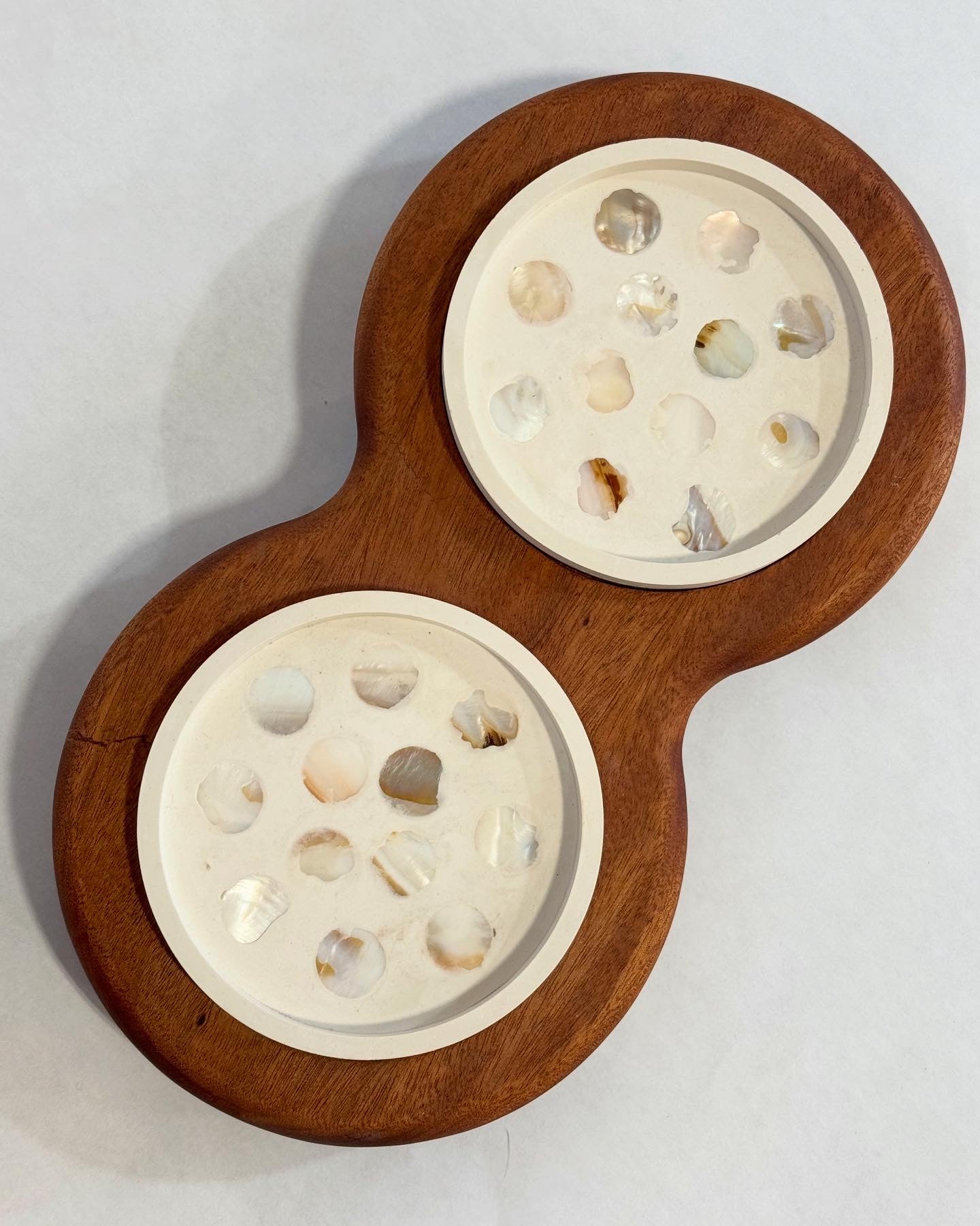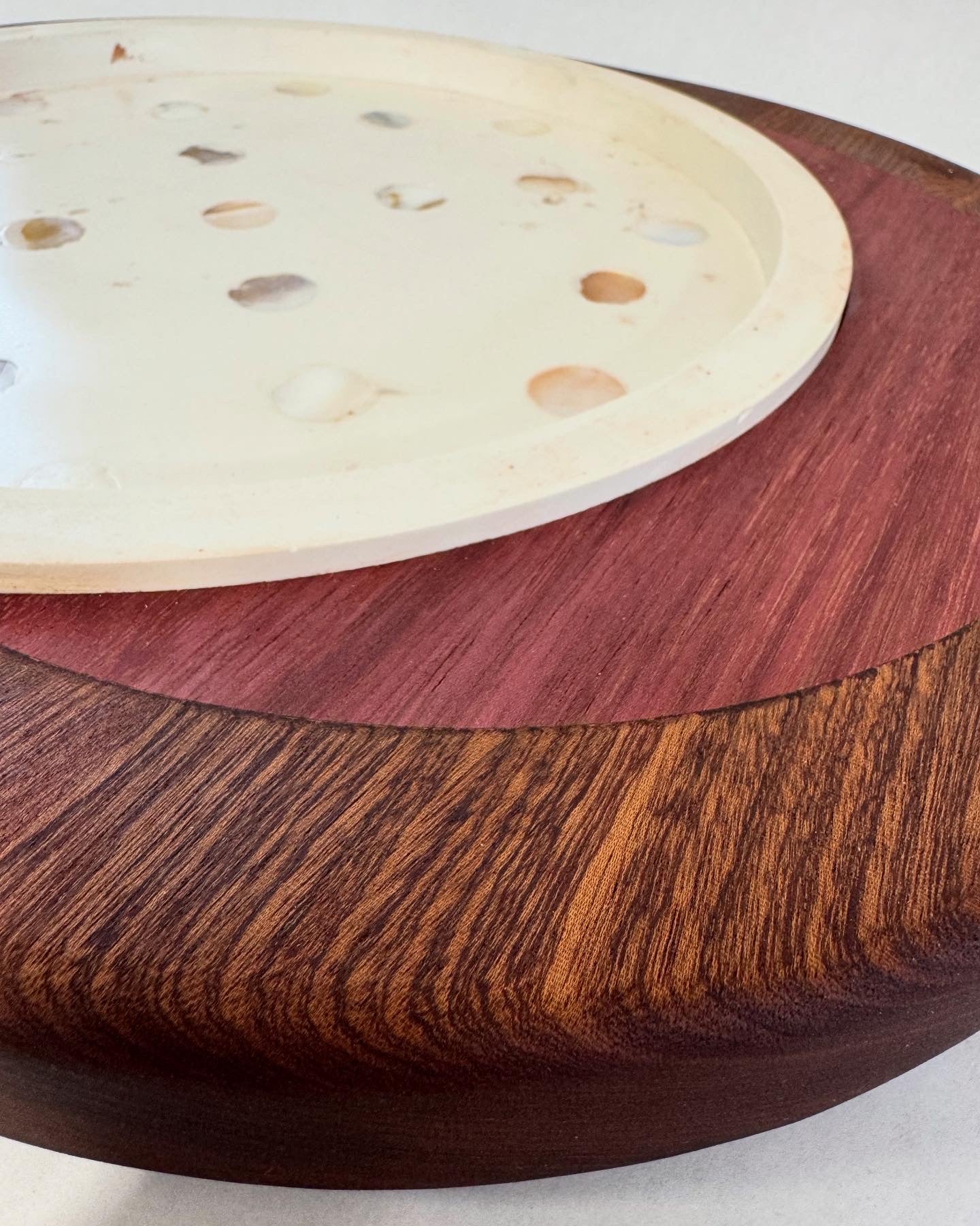 Gathering Light holds the quiet rhythm of reflection. Two circular forms cradle fragments of abalone, each one shifting with the light, like moments collected through the act of slowing down. The Mahogany base offers warmth and steadiness, grounding the luminous surface above.