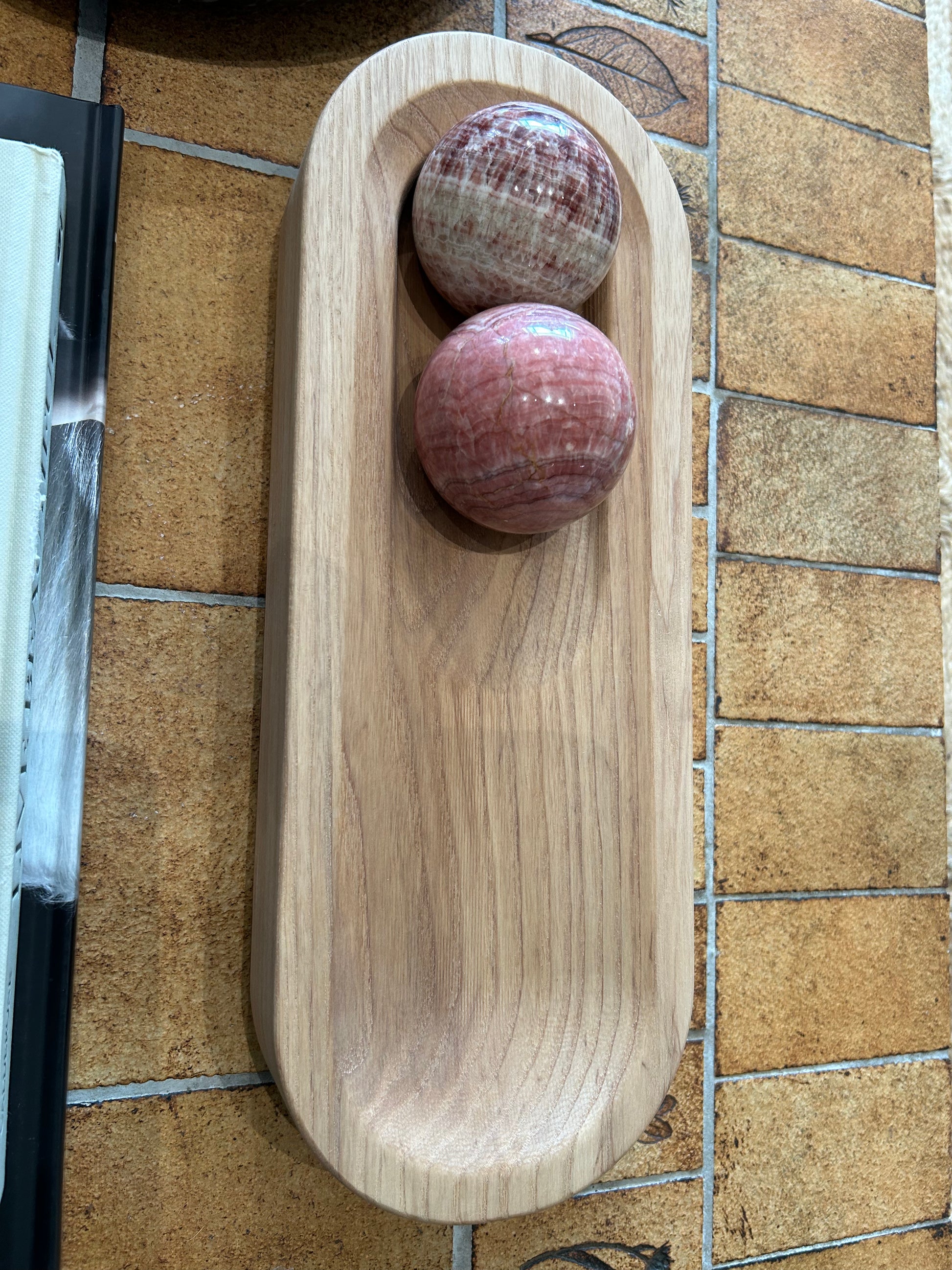 A quiet study in balance and connection. The carved Ash base holds two Rhodonite spheres that can be moved and rearranged, inviting touch and interaction. The warmth of the wood contrasts with the cool weight of the stone, creating a dialogue between grounding and tenderness.