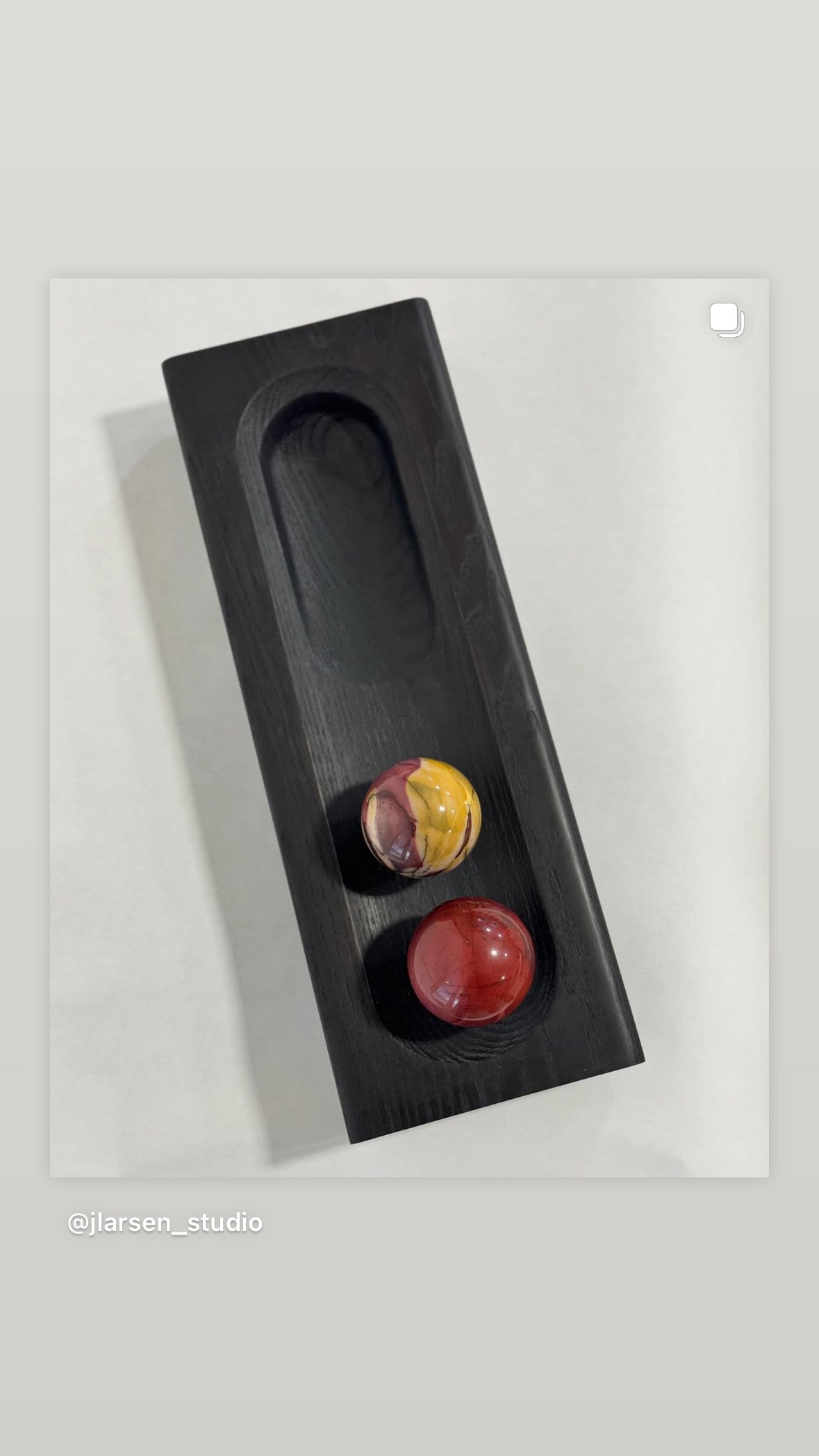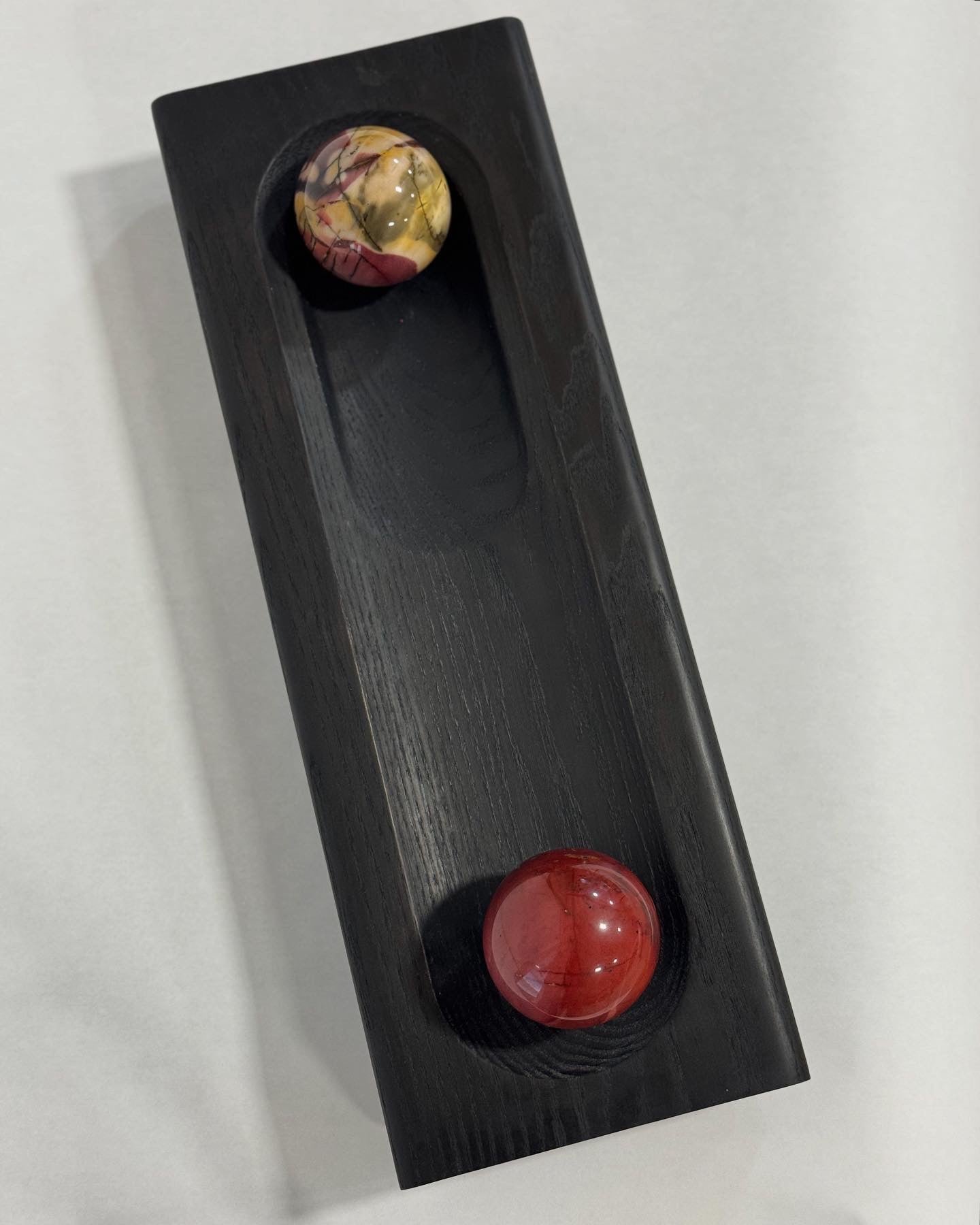 The orbs rest in carved hollows, free to slide and click against one another. Their arrangement is never fixed, responding to the hand, the energy of the room, and the curiosity of those who engage with them. The sculpture invites touch, encouraging us to listen, to feel, and to rediscover alignment in shifting form.
