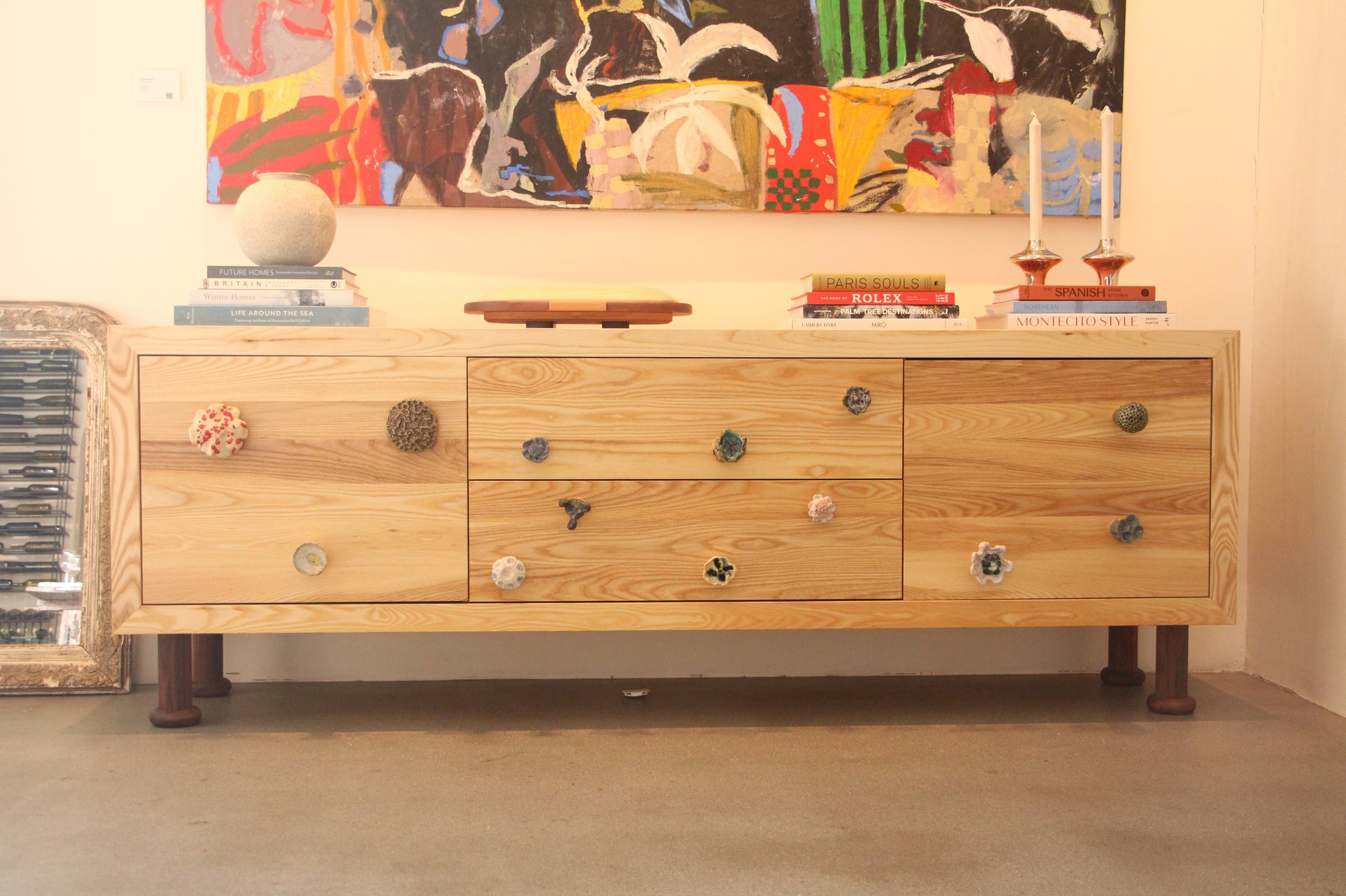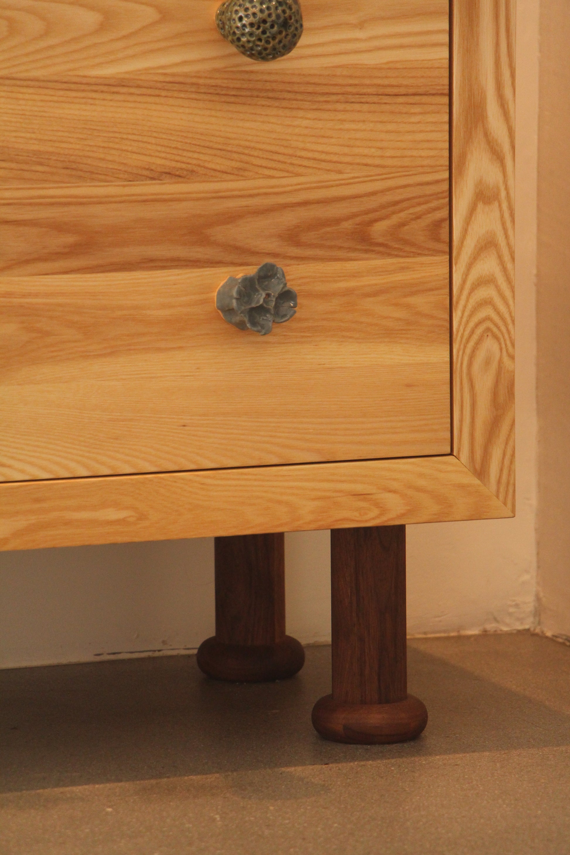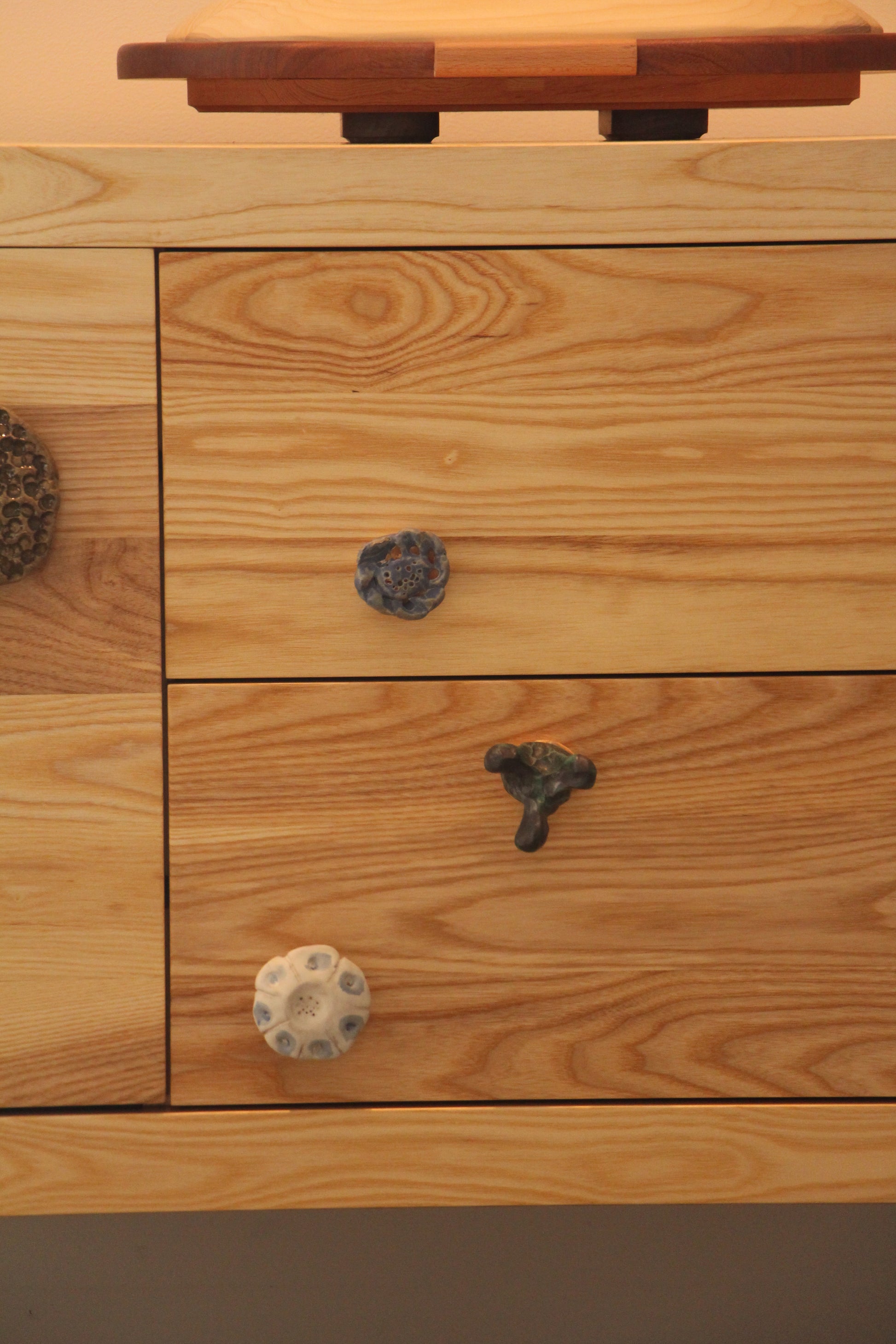 Individually sculpted ceramic hardware. Tow standard drawers and two cabinets.