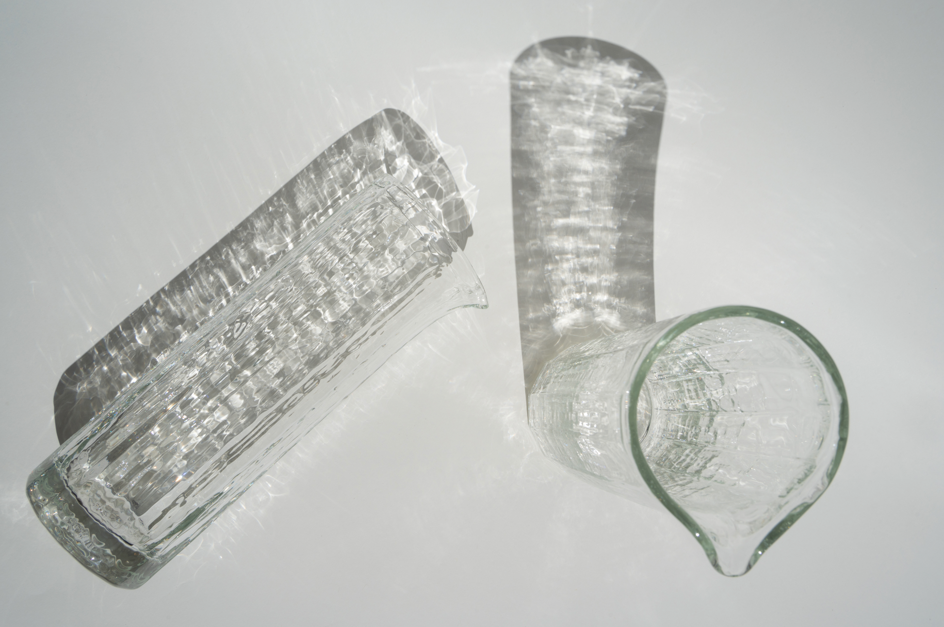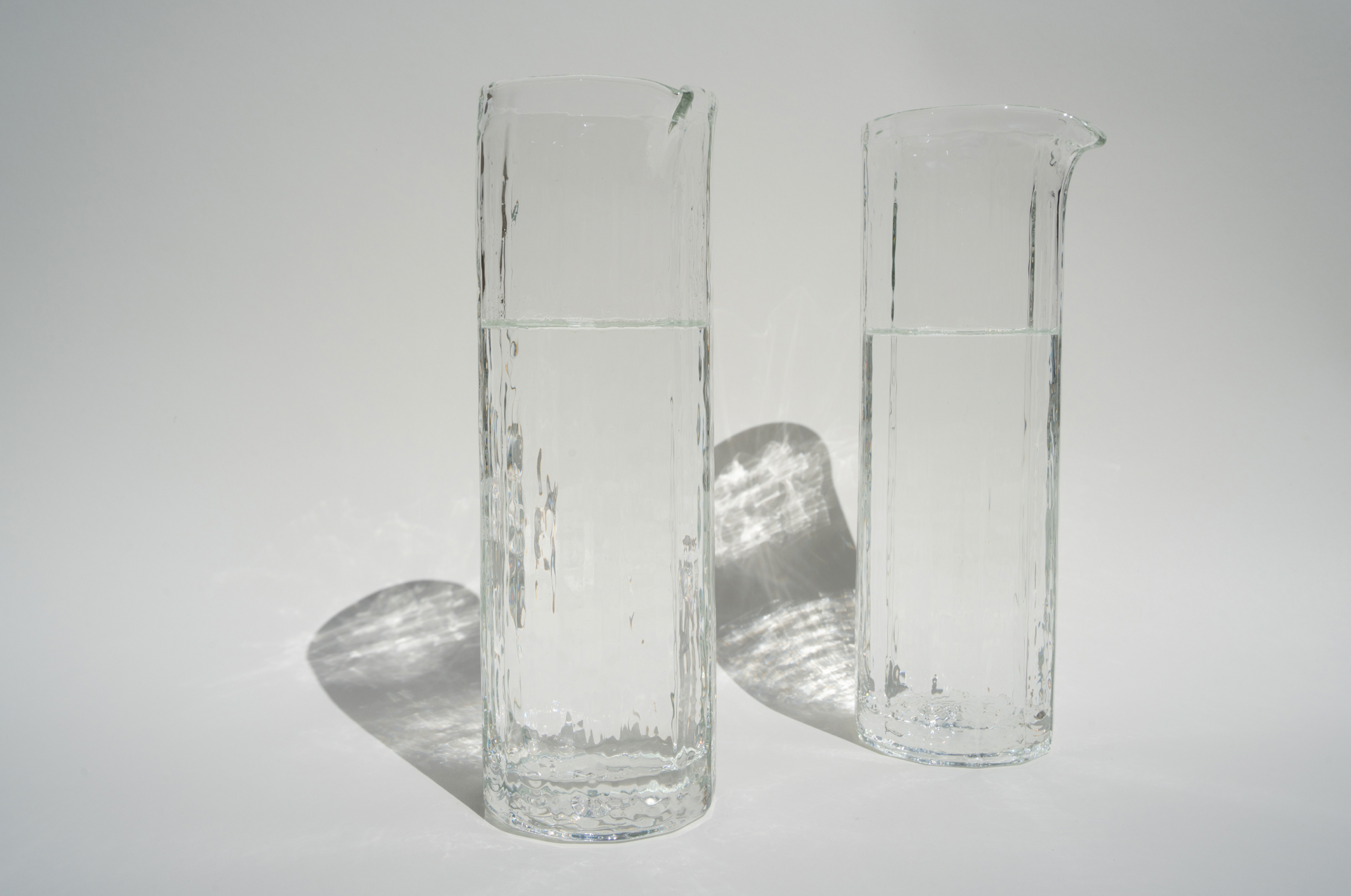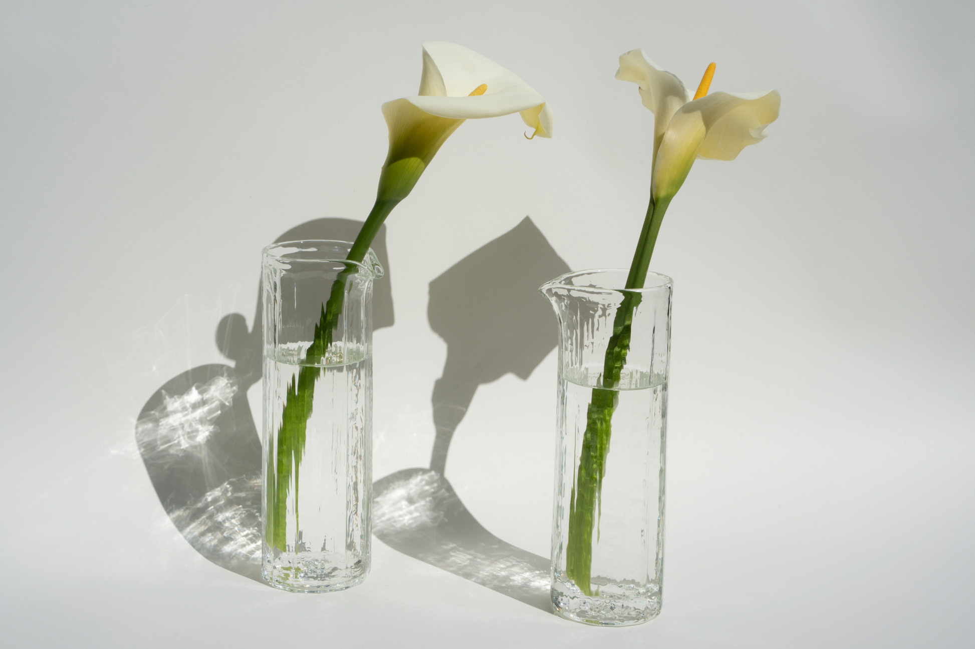 Our pitcher can hold a full bottle of wine, or provide water for the table. It also makes a lovely vase. All of our glass is made by hand. We developed a technique that yields a slightly different form each time, using a mold and form-making process that we developed with our glassblower.